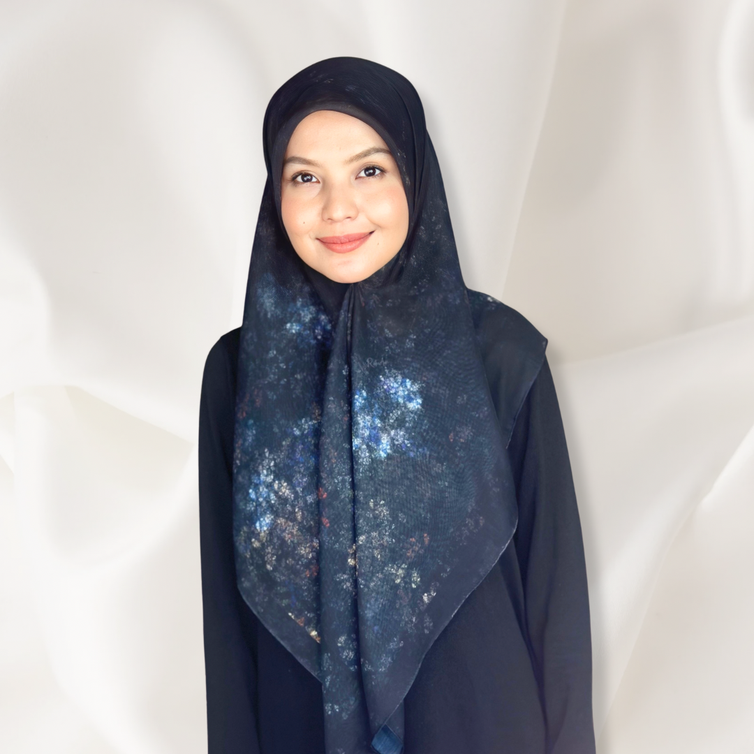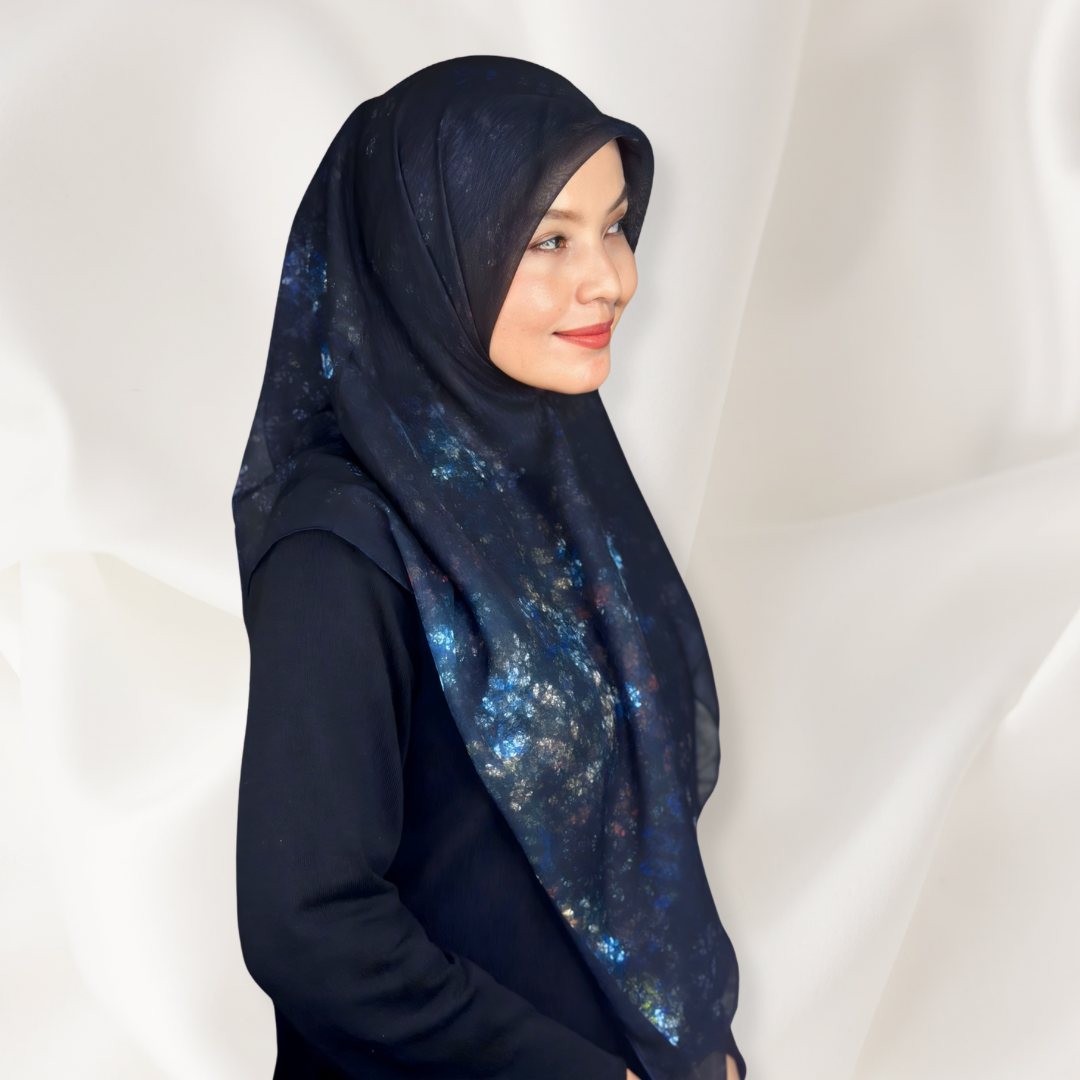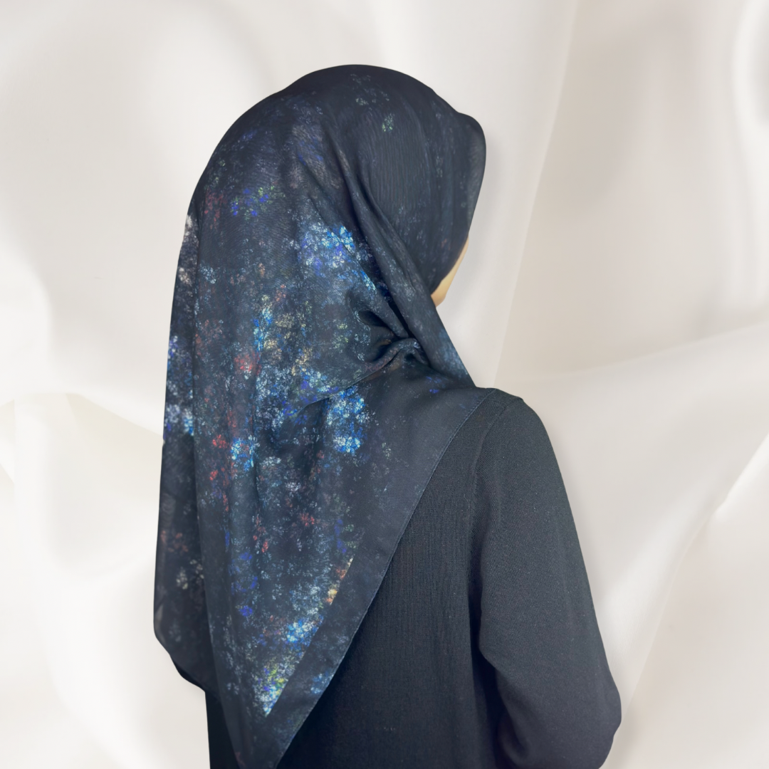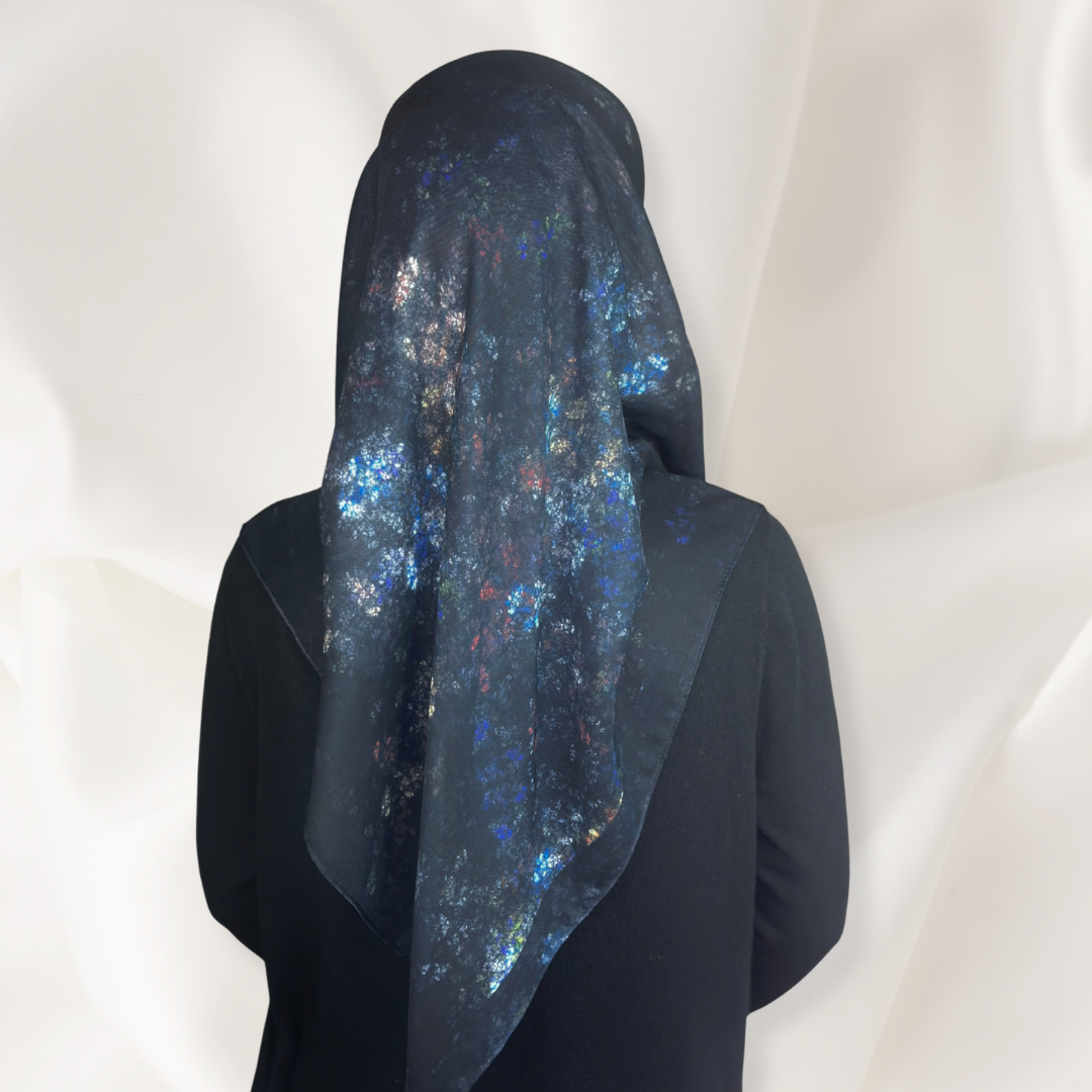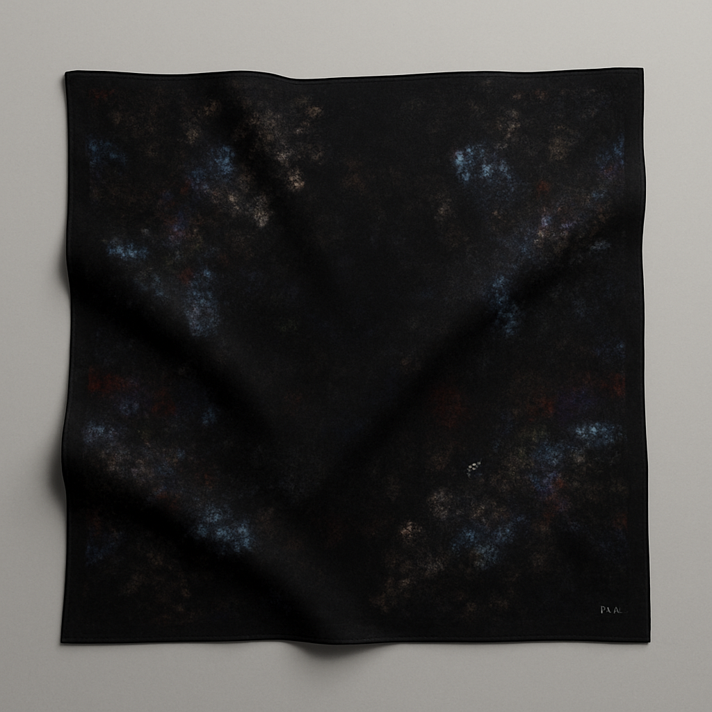 A captivating abstract night inspired pattern featuring soft clusters of light in blue, gold, and crimson tones against a deep black square. The design evokes the elegance of a quiet night sky mysterious, refined, and effortlessly luxurious