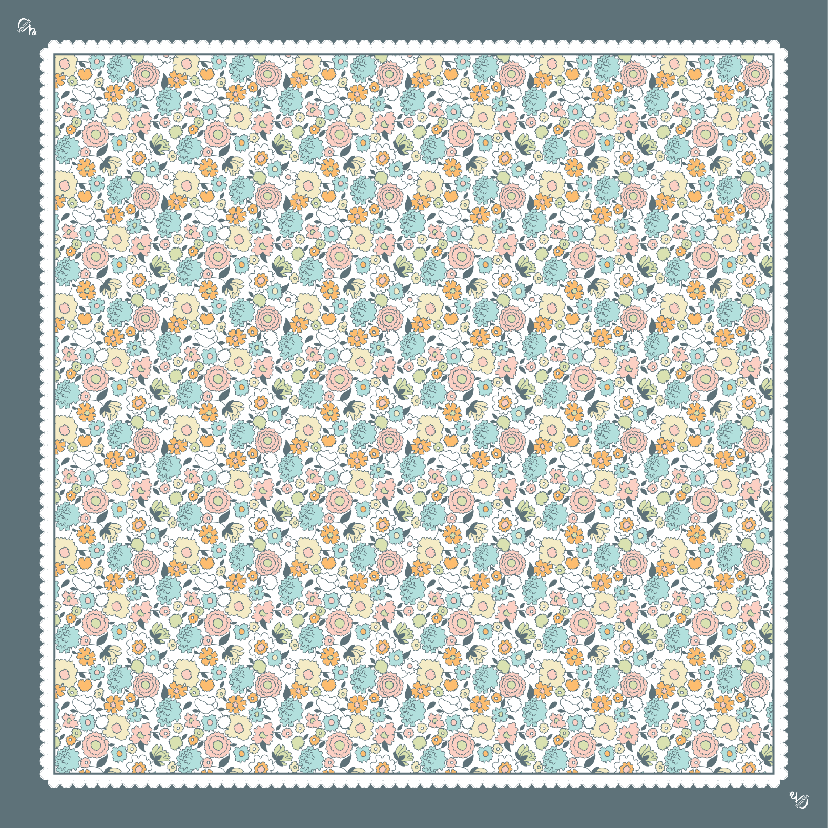 A dense arrangement of soft pastel mini florals, framed with an elegant teal border creating a fresh, refined, and luxurious look.