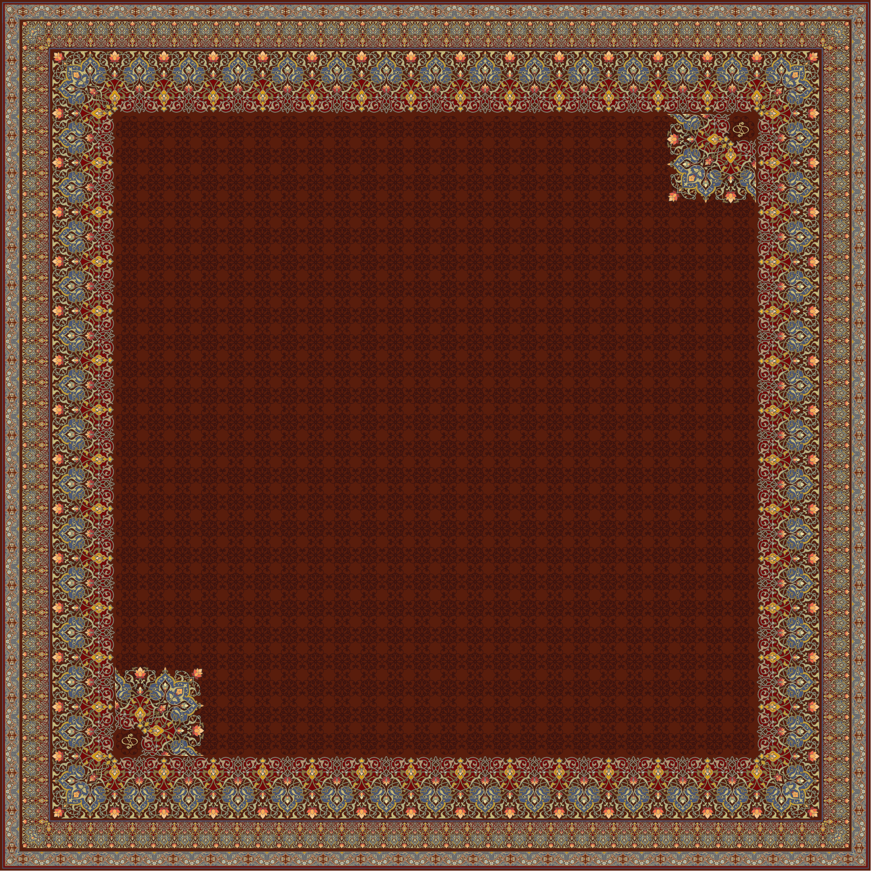 This design features an exclusive Middle Eastern. Inspired geometric motif set against a rich brick-Dark Maroon background. The intricate border in shades of gold, soft blue, and dark maroon adds a luxurious, classic touch. Delicate floral accents in the corners elevate the piece with a refined, elegant feel, perfect for both everyday sophistication and special occasions.