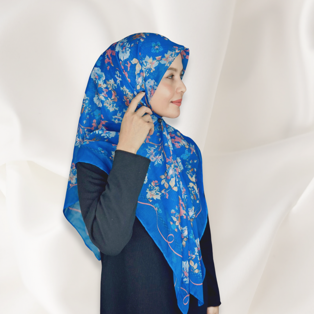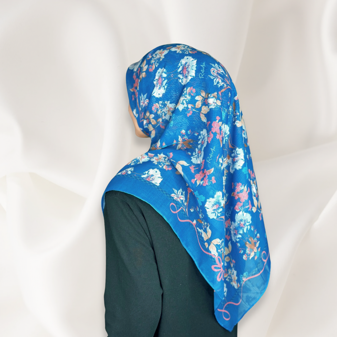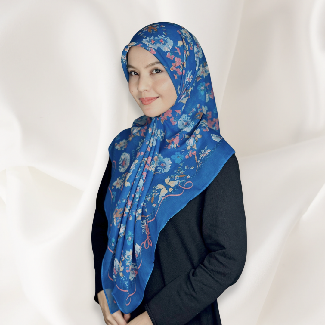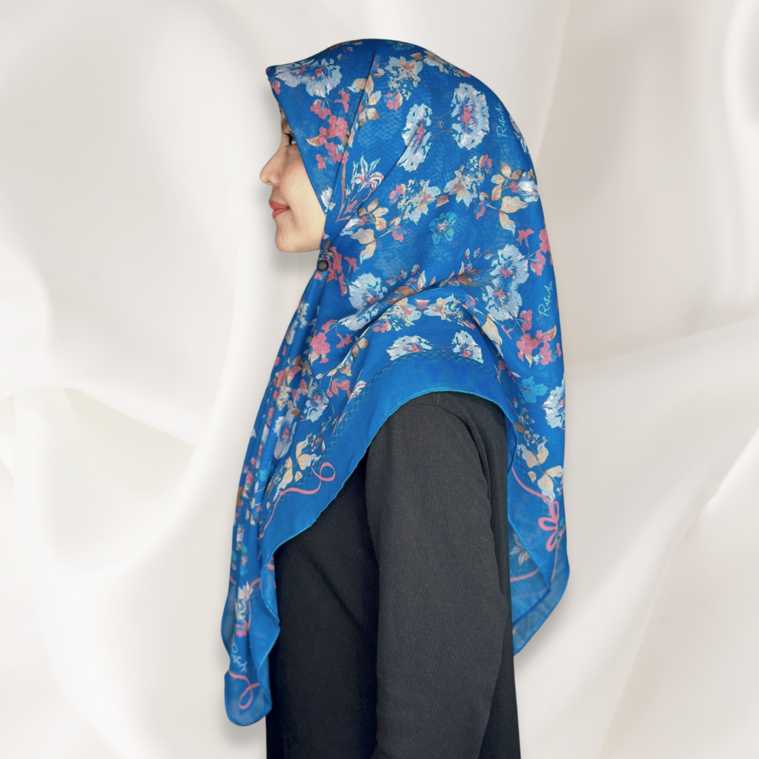 A refined teal blue scarf adorned with intricate floral motifs in blue, coral and gold tones, creating a timeless classic pattern with a modern elegant touch.