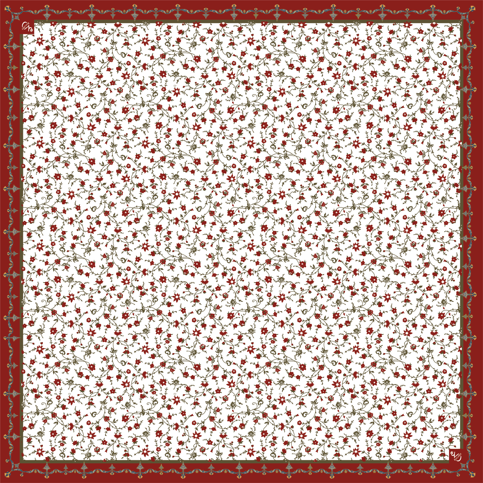 A square patterned design featuring a dense field of small red flowers with green vines on a white background, framed by a wide red border decorated with gold ornamental details.