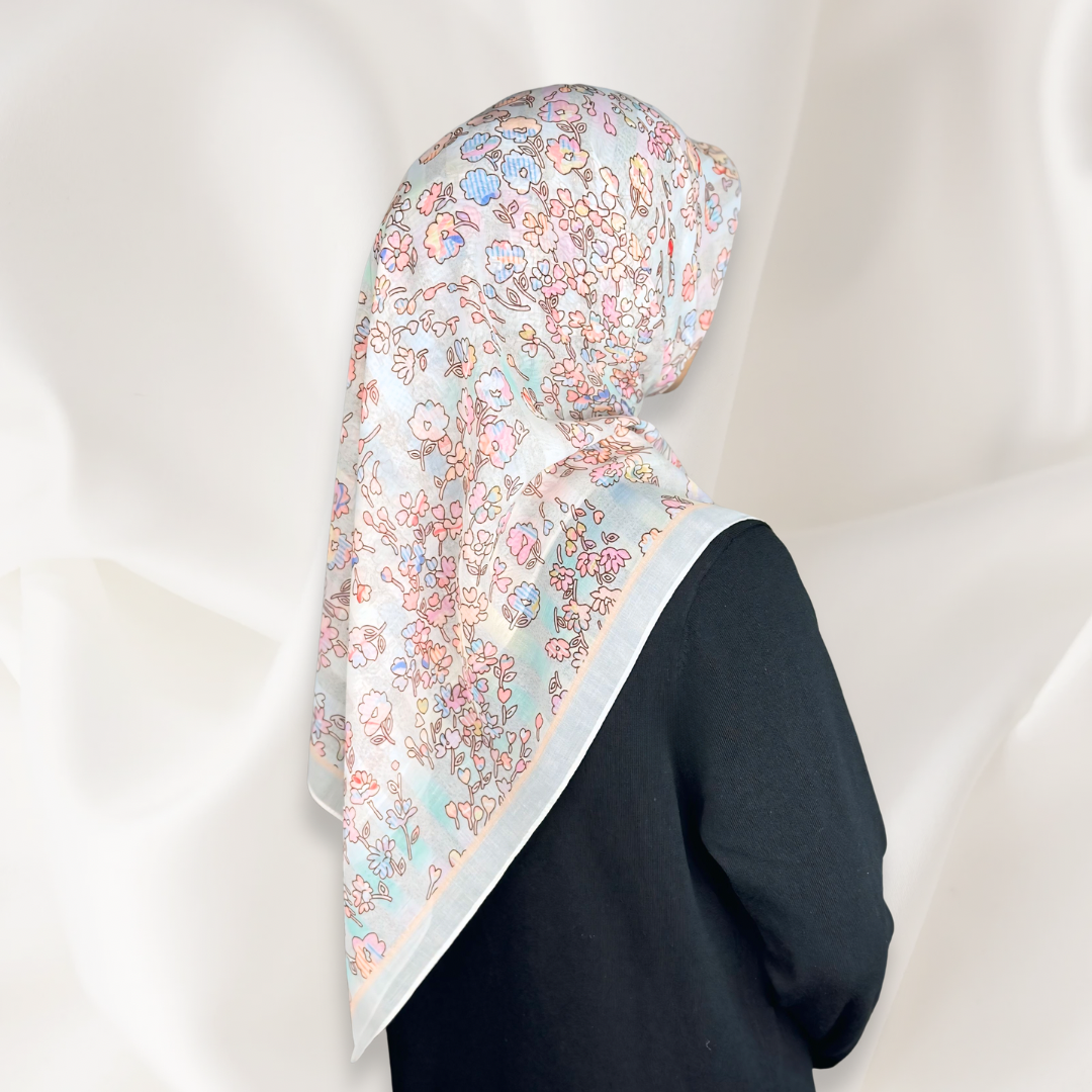 A soft pastel floral design featuring delicate blossoms that appear to drift gracefully across a gentle striped background, creating a fresh, feminine and cheerful spring inspired look.